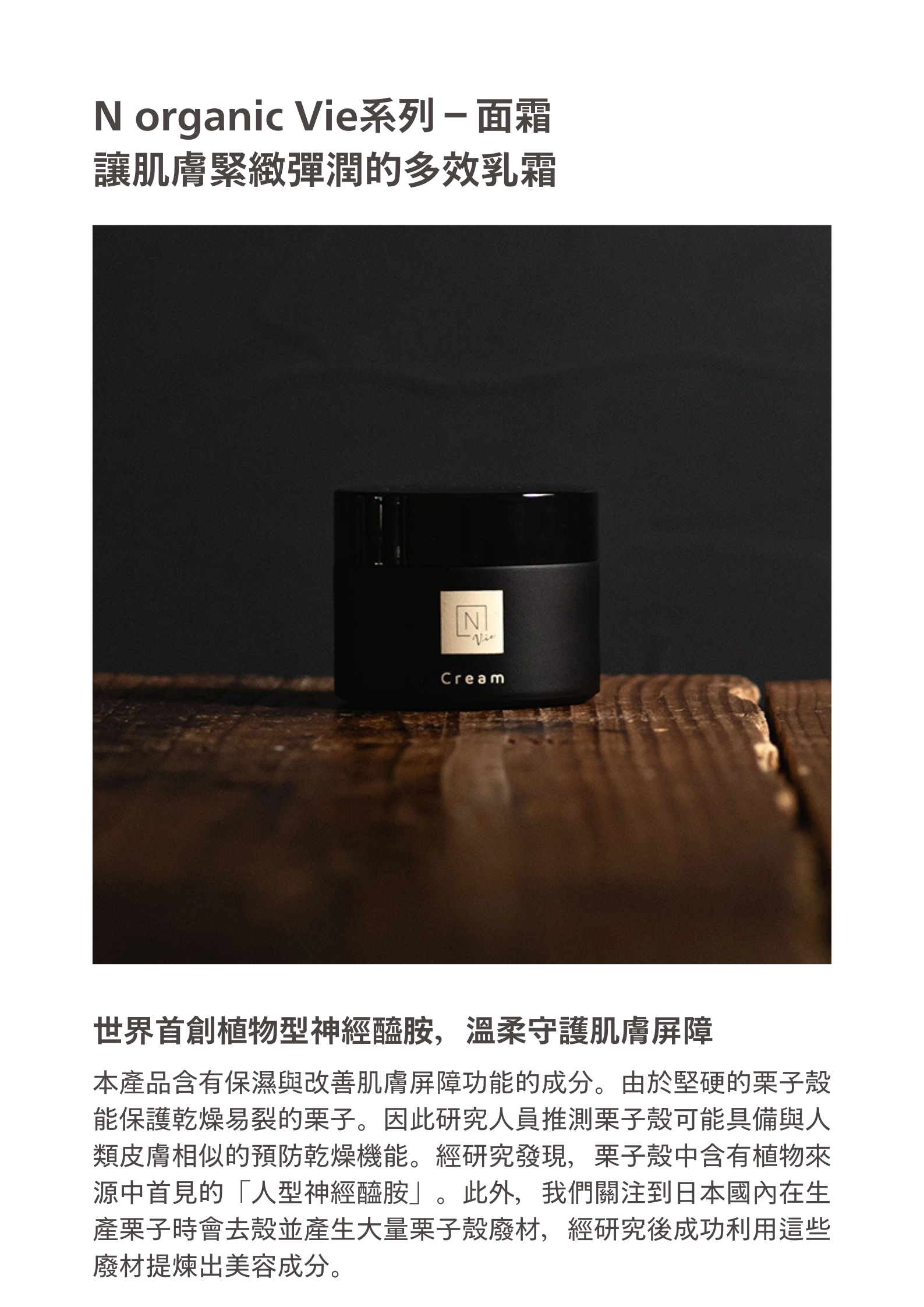 採用全球首創的植物來源人型神經酰胺,溫和地為肌膚建立屏障,有效支援保濕和屏障功能。透過對栗子硬殼的研究發現,栗皮中含有能防止乾燥的成分,並首次提取到植物來源的人型神經酰胺。此外,藉由關注國內栗子產區在去殼過程中產生的大量栗皮,成功將廢材轉化為美容成分。