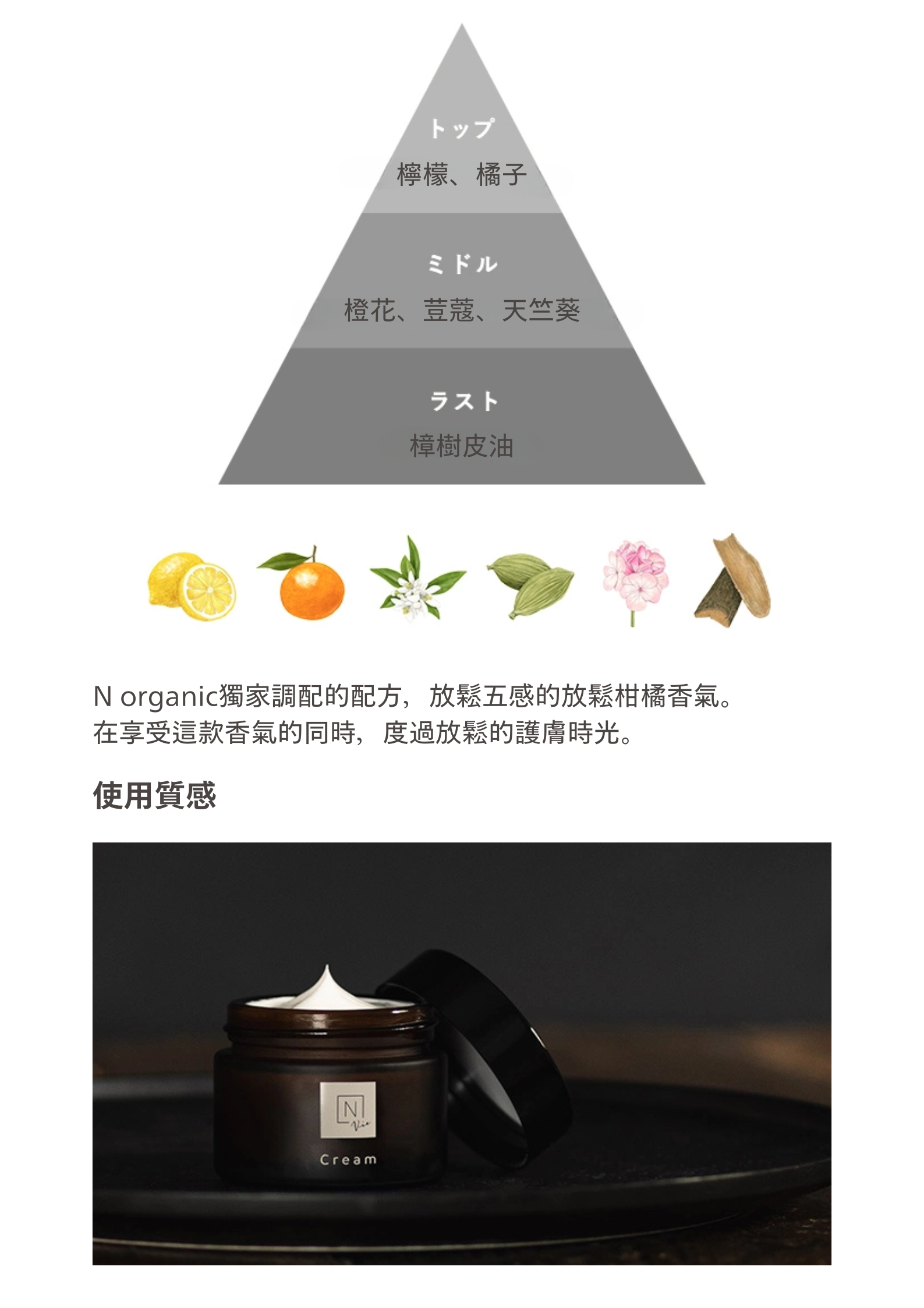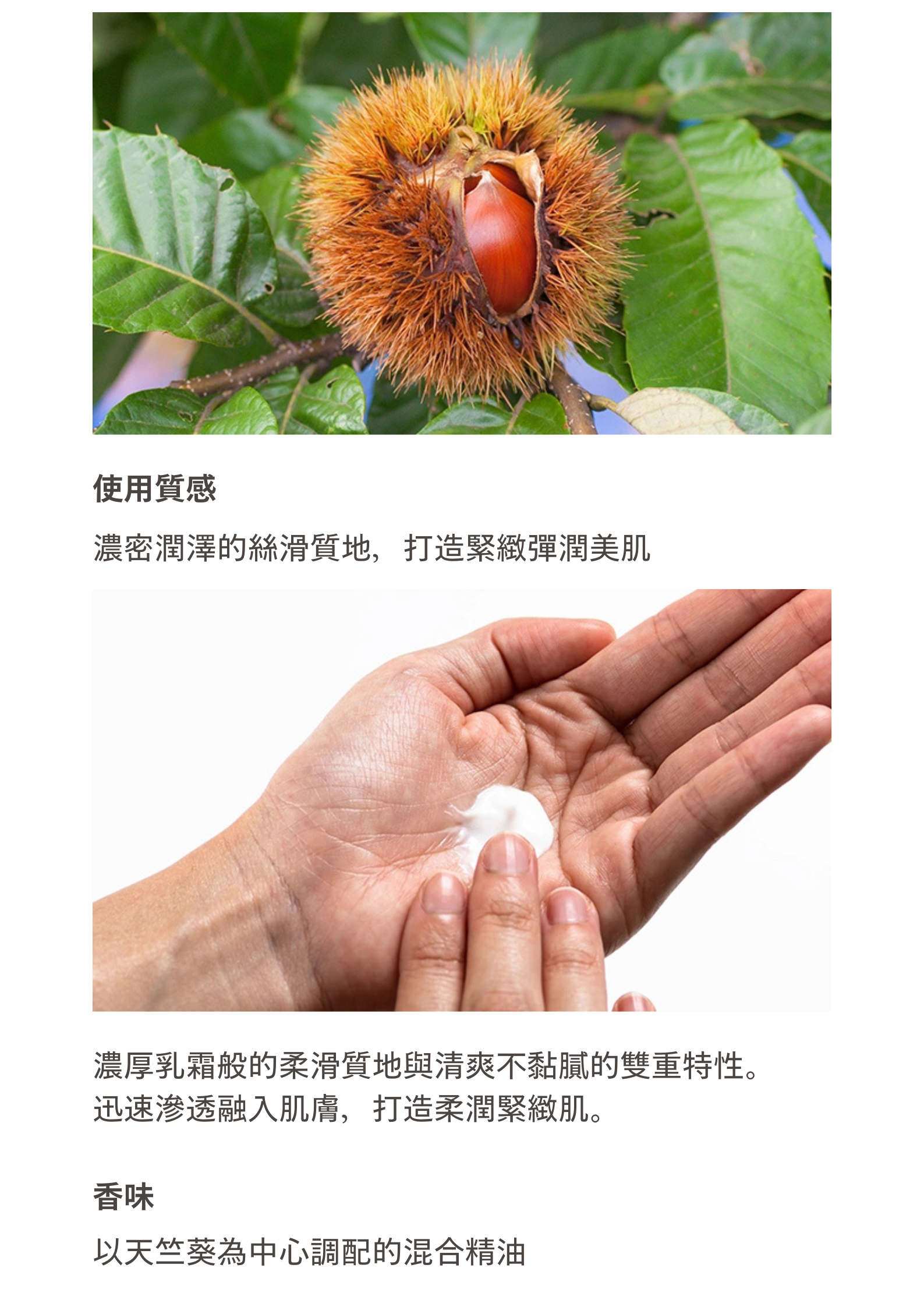 雖然是濃厚乳霜狀質地,但使用時不會感到黏膩,霜體能迅速融化,深入肌膚,帶來柔軟緊緻的效果,深層滋潤至角質層。