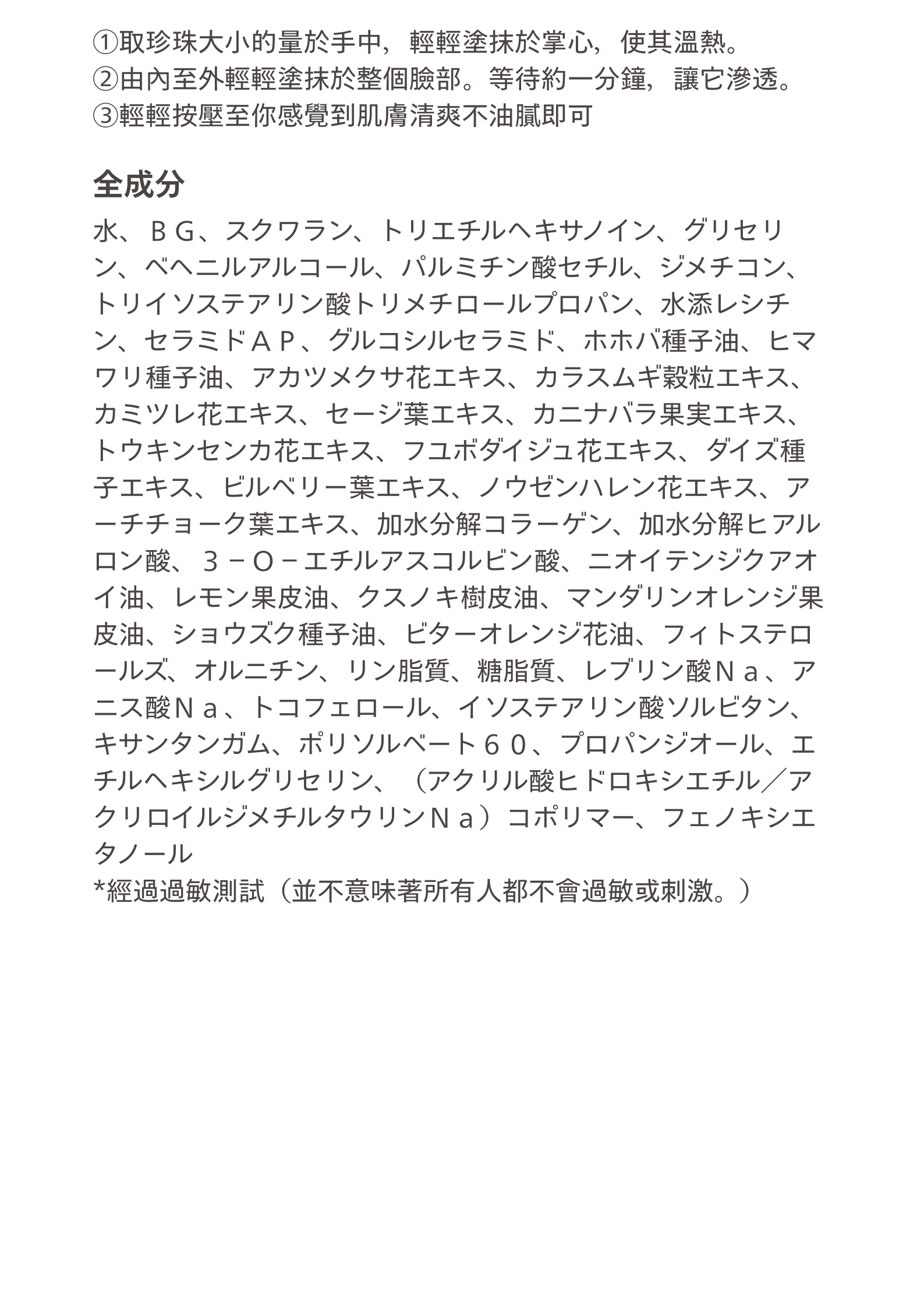 主要成分:植物(和栗)來源的人型神經酰胺(神經酰胺AP/保濕成分)。